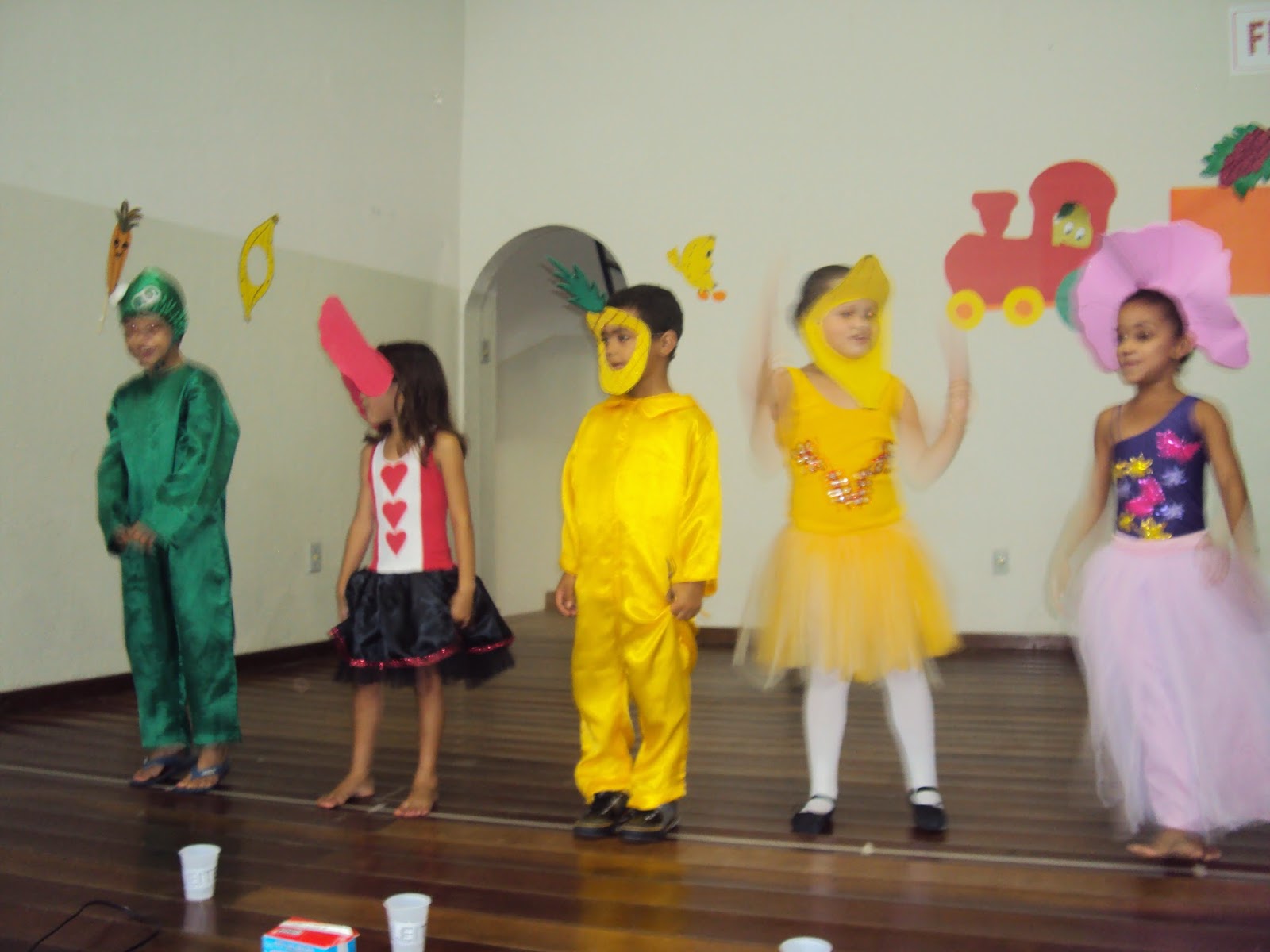 A partir da coleção Frutolândia montamos um teatro que foi apresentado pelos meus alunos na culminância do projeto. As outras turminhas apresentaram quadrinhas e músicas sobre alimentação. Ficou muito linda a apresentação.